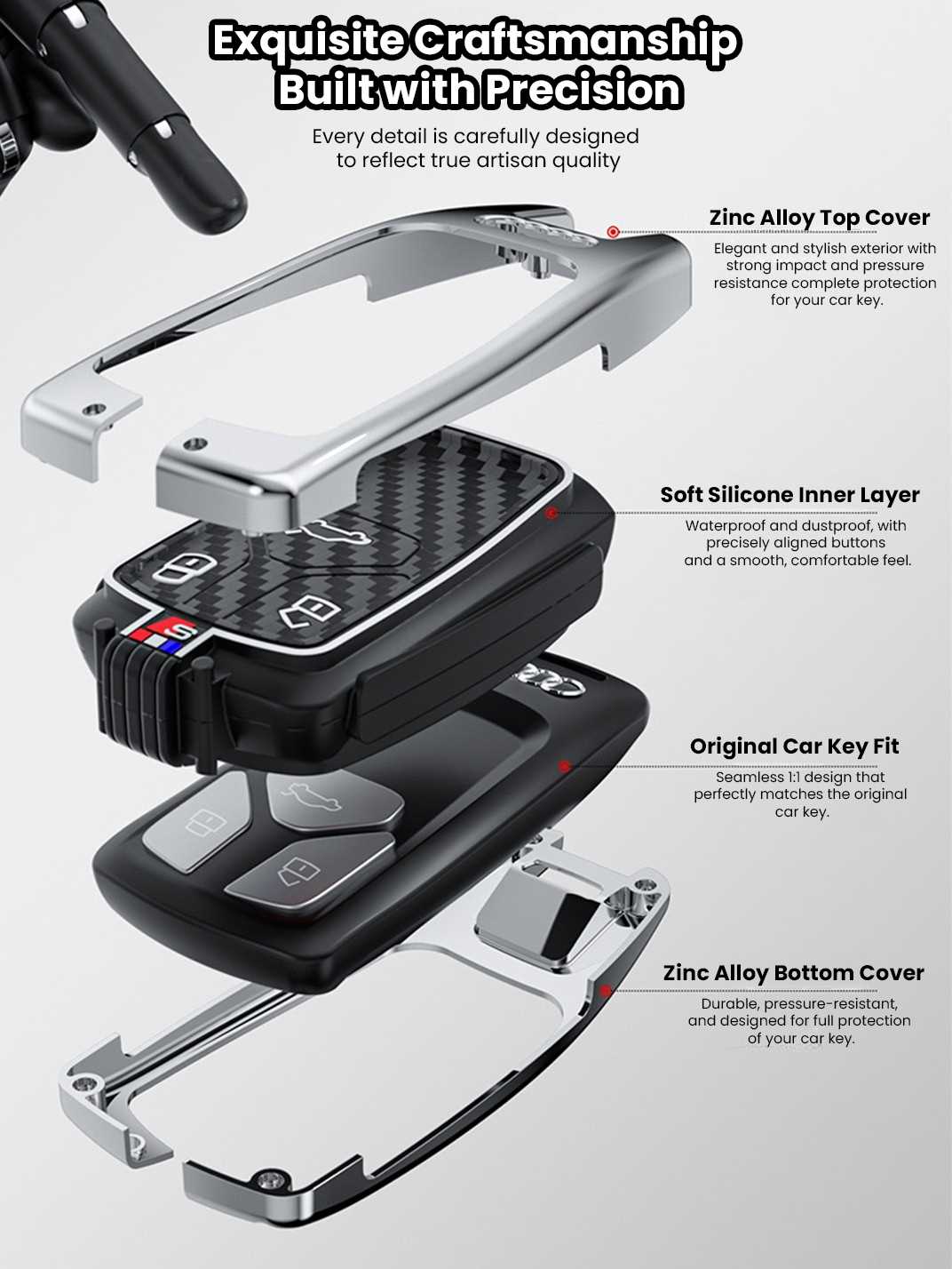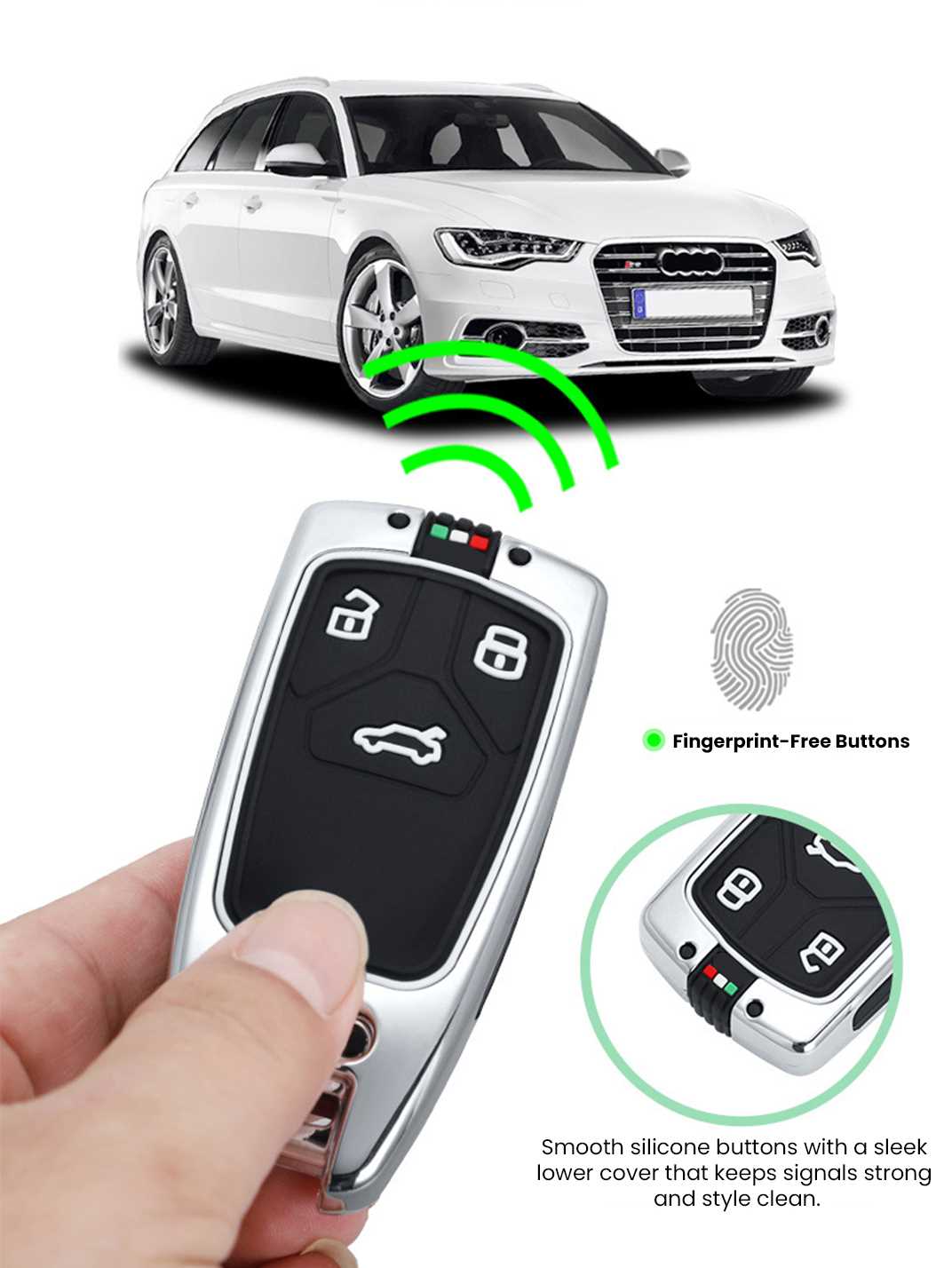 This Audi key cover combines a solid zinc alloy exterior with a soft inner layer to guard against damage from drops, abrasion, and everyday use. OEM-style fit ensures seamless button access and reliable keyless operation.