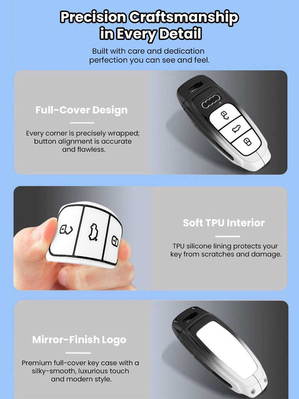 This premium key cover wraps your Audi key in full protection, combining a solid zinc alloy exterior with a soft TPU inner layer to guard against drops, scratches, dust, and everyday wear without affecting key function.