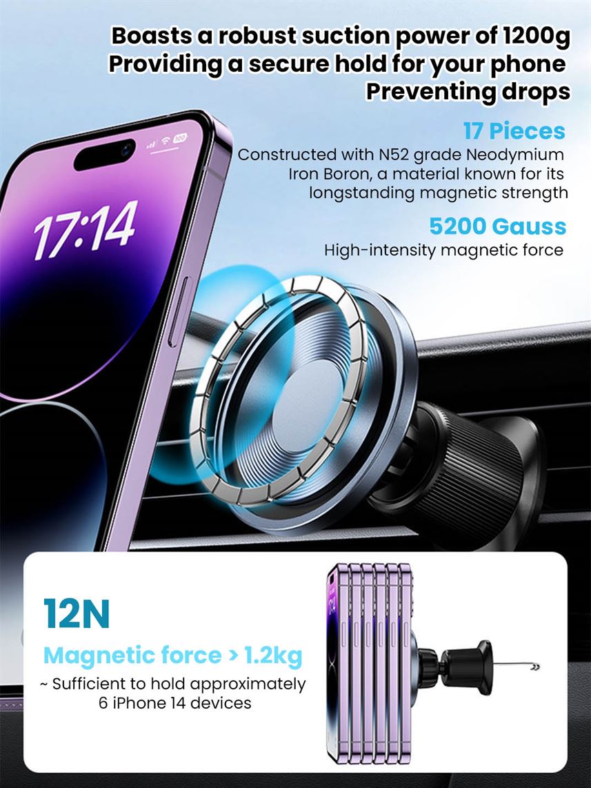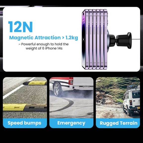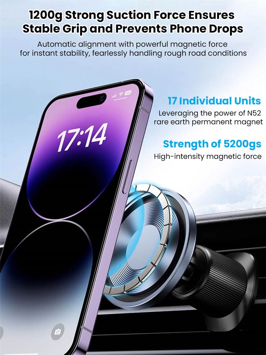 Provides robust 1200g suction and N52 magnet for secure phone hold, even on rough drives.